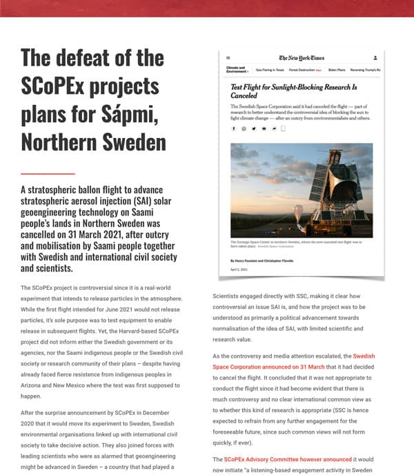 We build and support campaigns against geoengineering projects and for sound policies and restrictive regulations and governance.