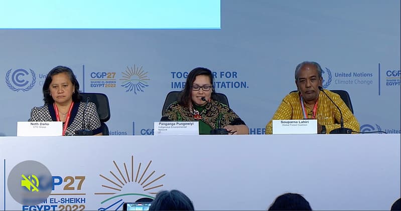 HOME Alliance Press conference at COP27, featuring Souparna Lahiri (GFC), Peg Putt (EPN / Biomass Working Group), Panganga Pungowiyi (IEN), Neth Daño (ETC Group), Nnimmo Bassey (HOMEF), Erika Lennon (CIEL). Link to UNFCCC web-TV.