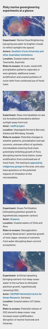 A recent announcement of the first open-air test of solar geoengineering technology in Australia is one of several types of geoengineering that could cause permanent damage to ecosystems if implemented at scale. However, Australia is not the only such dangerous, precedent-setting experiment.